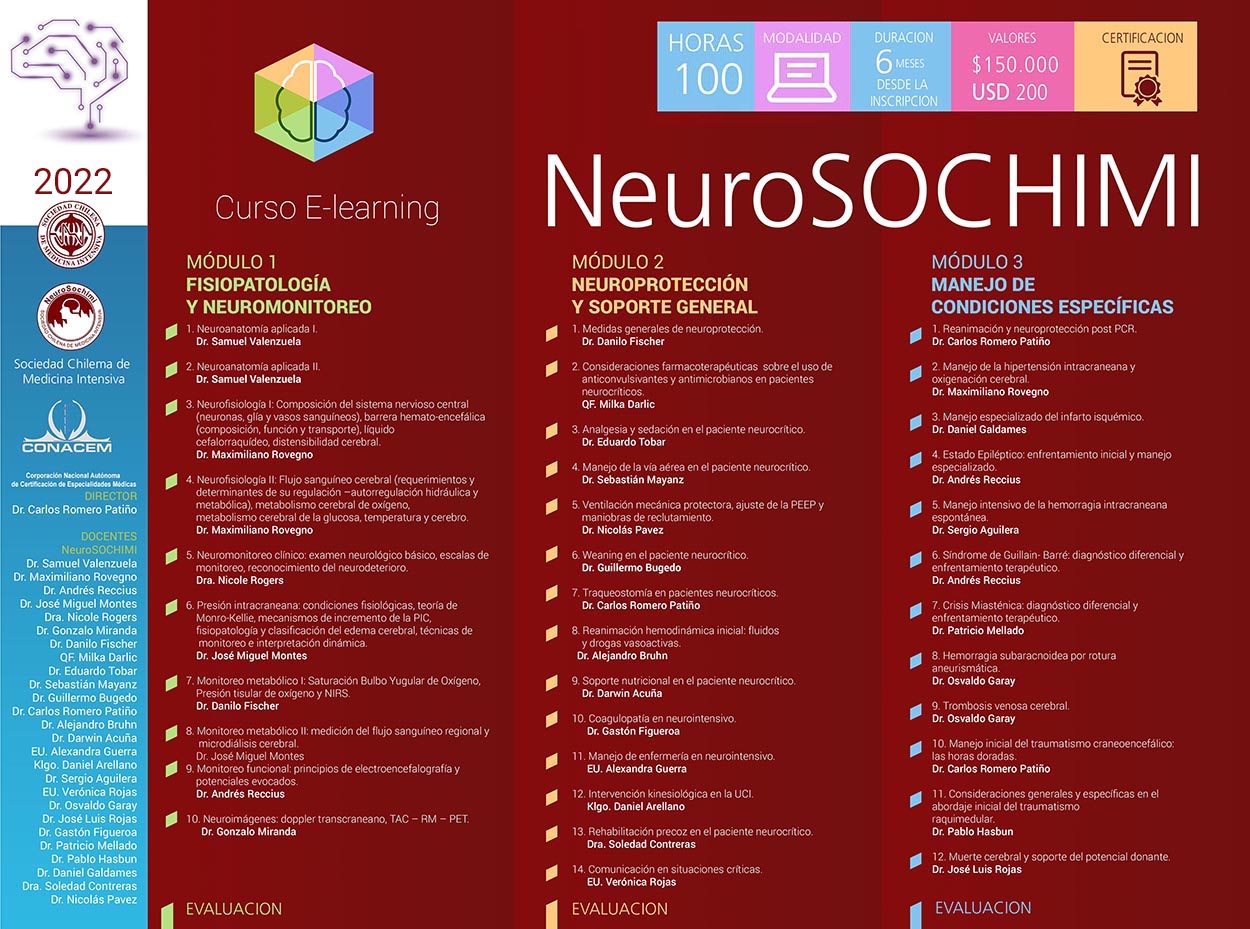 Esta nueva versión interprofesional, compuesta por 3 módulos y 36 clases, cuenta con la participación de reconocidas y reconocidos docentes y especialistas en el área, quienes van a exponer los aspectos más relevantes del manejo de los pacientes neurocríticos. Al finalizar cada módulo se deberá rendir una prueba online que requiere un puntaje superior al 70% para ser aprobada y permitir el acceso al siguiente nivel. El Curso E-learning NeuroSOCHIMI, con un total de 100 horas académicas avaladas por CONACEM, ha sido planificado para ser completado en un período de 6 meses desde el momento de la inscripción y se encuentra dirigido a especialistas en medicina intensiva, medicina de urgencia, neurología y neurocirugía, residentes de urgencia y Unidades de Pacientes Críticos (UPC), así como a profesionales en proceso de formación.